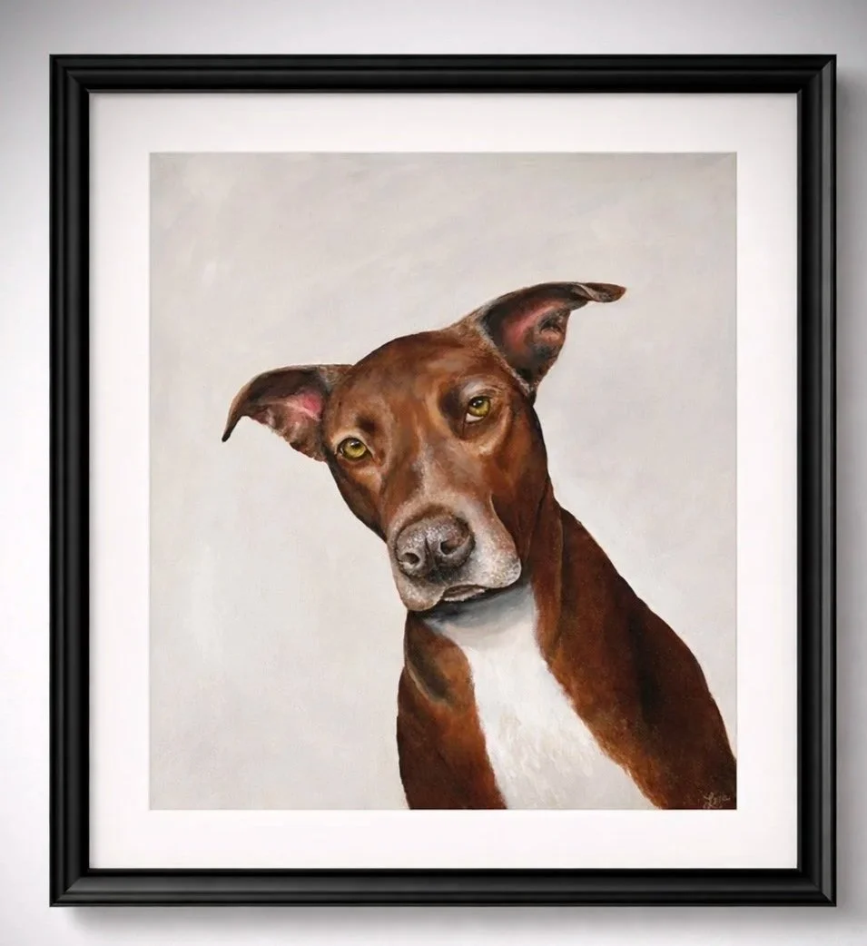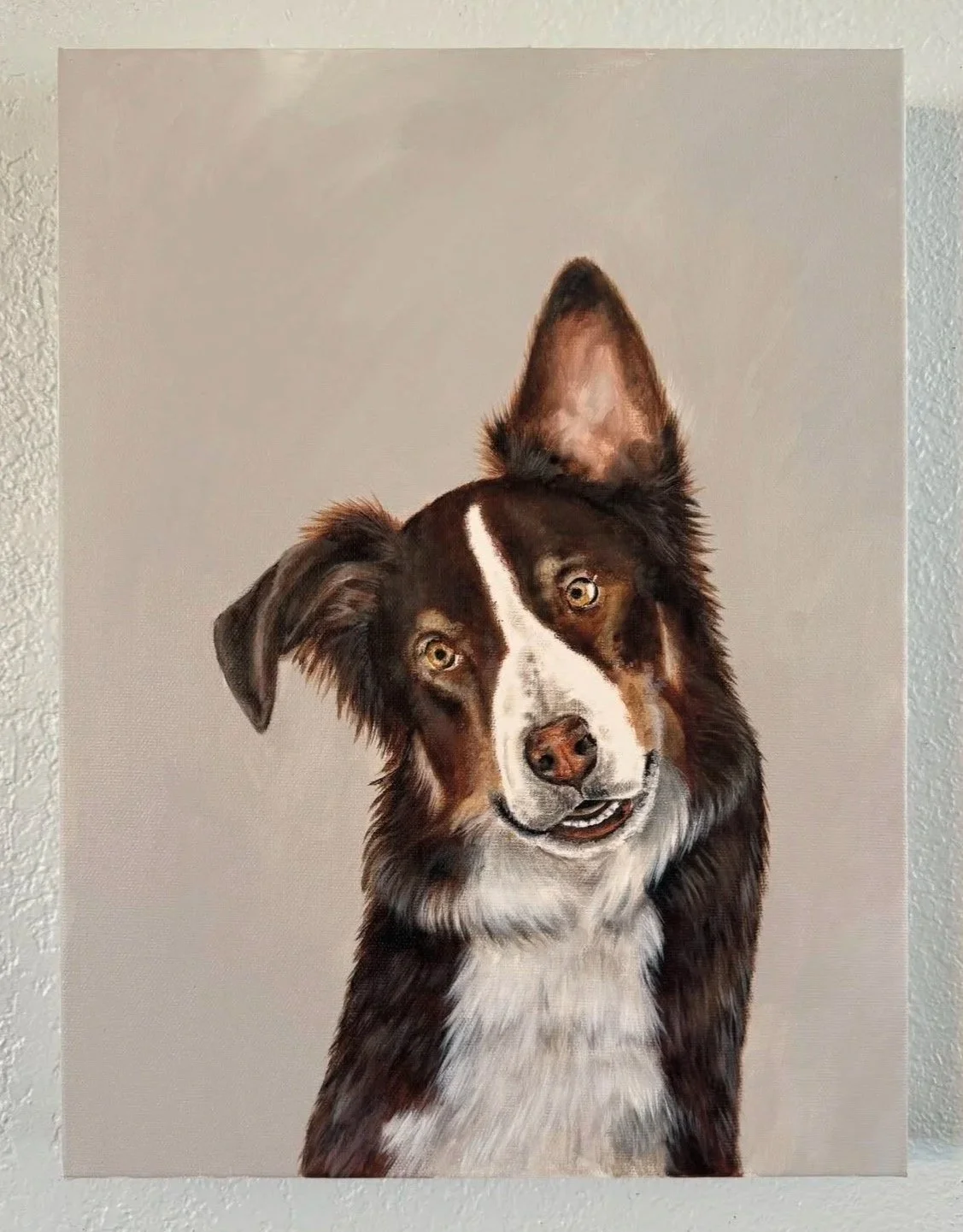 A simple acrylic dog portrait on canvas: a clean, minimalist depiction of your pet rendered with smooth, confident brushstrokes. The composition centers the dog’s head and upper chest against a softly blended, muted background that enhances but does not compete with the subject. Color choices are limited to a small palette that captures key fur tones, eye color, and subtle highlights—no unnecessary details.